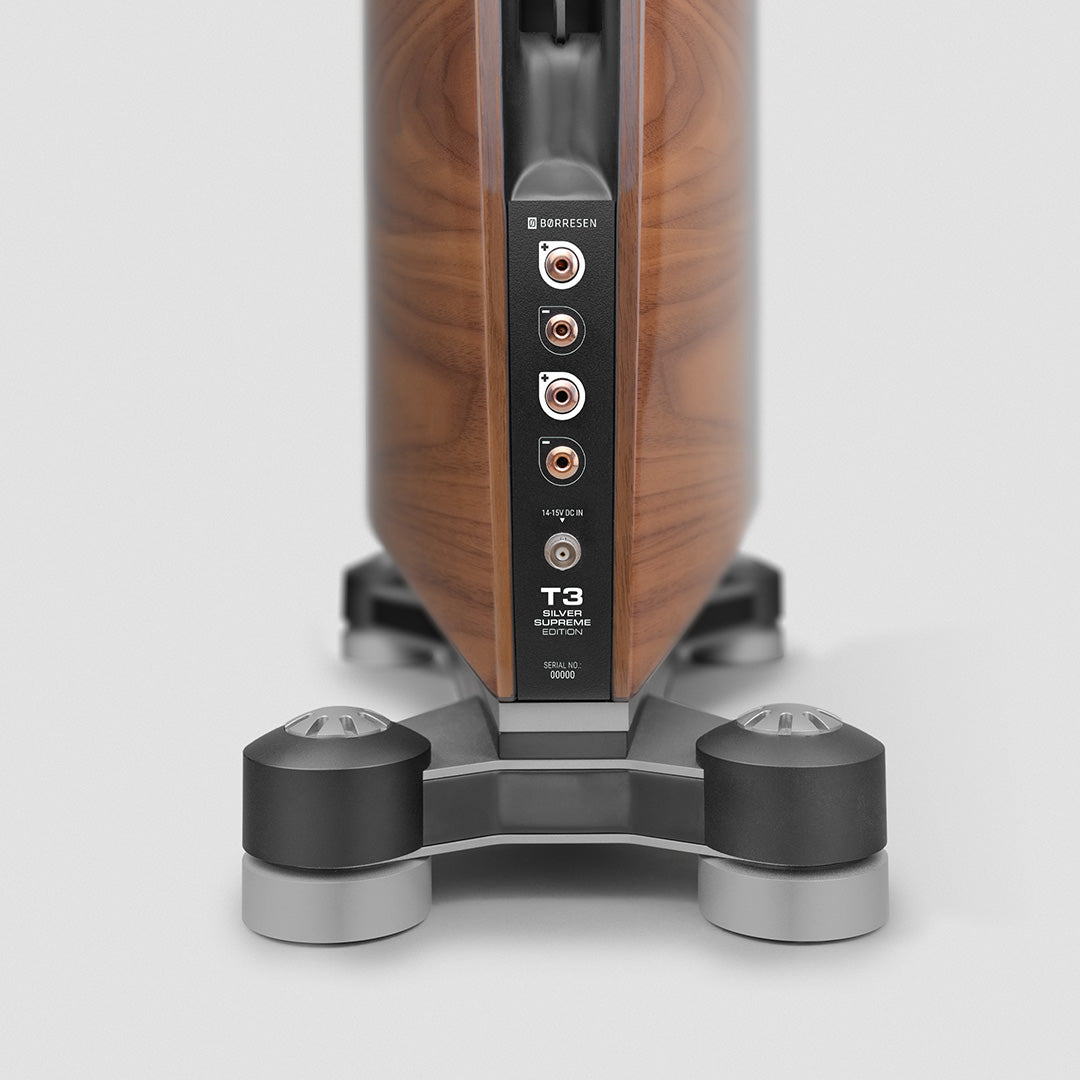 Børresen T-serien kombinerer højglanslak med ægte træfiner. Massivtræsafstivninger, fræset i blokke, og forstærkninger i kulfiber øger både stivhed og luftgennemstrømning. Et bagudvendt ventilationssystem sikrer, at enhederne kan aflade trykket effektivt. Det mindsker forvrængning og opbygning af overtryk i kabinettet. Kabinetkonstruktionen er nøje gennemtænkt og giver en åben, rummelig og dynamisk lyd. Samtidig har højttaleren et moderne og elegant udtryk – og fylder minimalt i rummet.