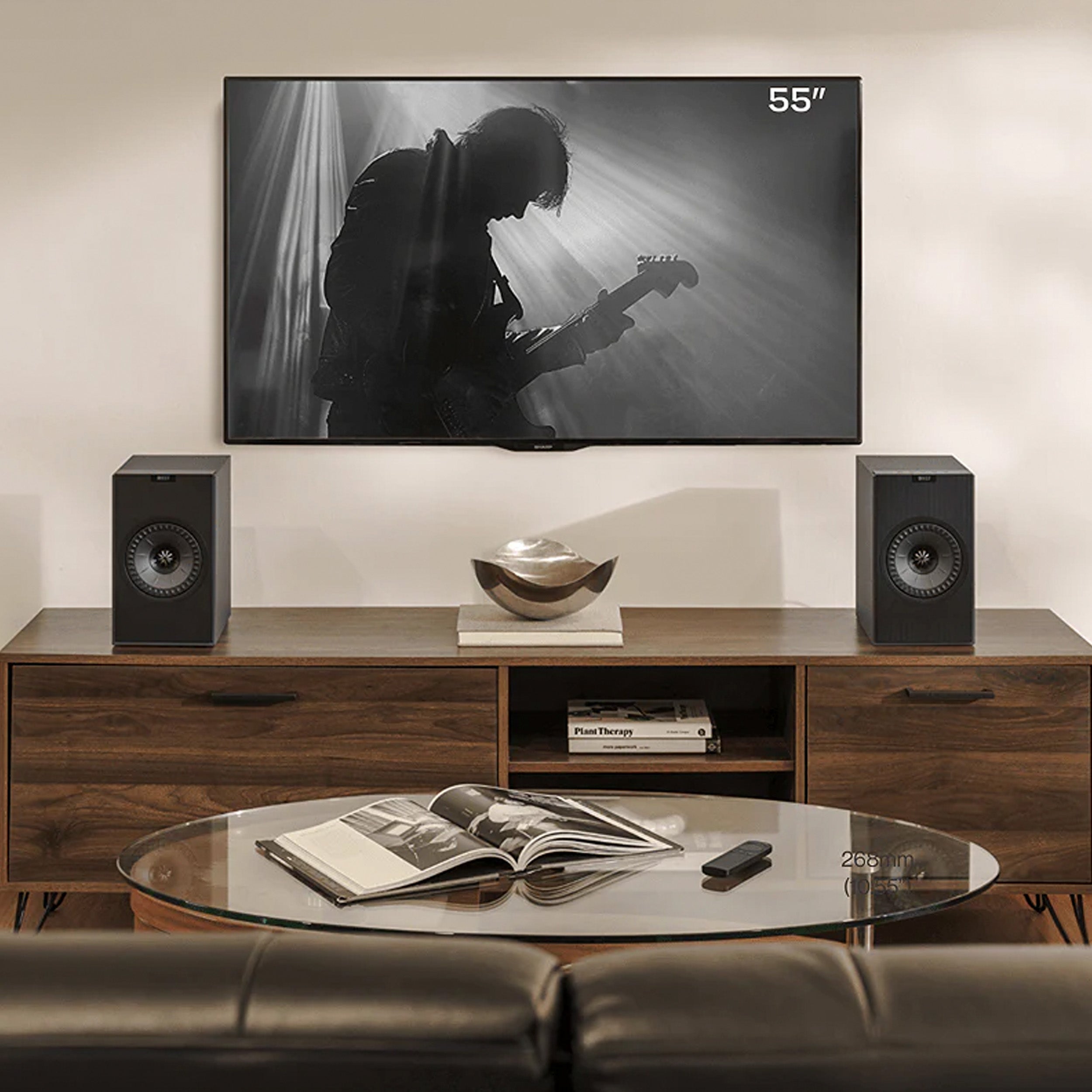 De diskrete topknapper giver nem adgang til de vigtigste funktioner, mens KEF Connect appen åbner op for fuld kontrol over lydindstillinger, kildevalg og opdateringer – direkte fra din telefon. Du kan desuden vælge mellem forskellige EQ-profiler, så lyden altid passer til din smag og dit rum.